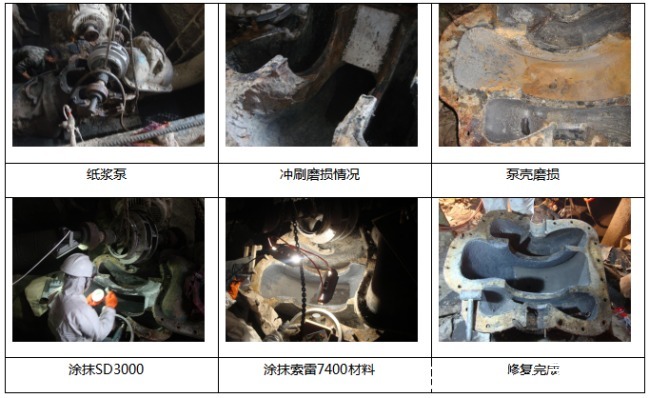 某企业的纸浆泵型号:中开双吸调质泵;转速:1450转/分钟;材质:球墨铸铁;介质:纸浆;泵体冲刷严重,局部穿孔,密封环部位磨损20mm。因为泵受工作环境影响,冲刷磨损、气蚀、腐蚀等问题较为突出,对企业的运行成本造成严重影响。